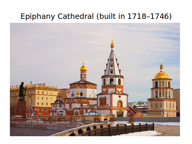 The Epiphany Cathedral (left), the governor's palace, a school of medicine, a museum, a military hospital and the crown factories are among the public institutions and buildings. The Aleksandr Kolchak monument, designed by Vyacheslav Klykov, was unveiled in 2004. On July 27, 2004, the Irkutsk Synagogue (1881) was gutted by a conflagration.